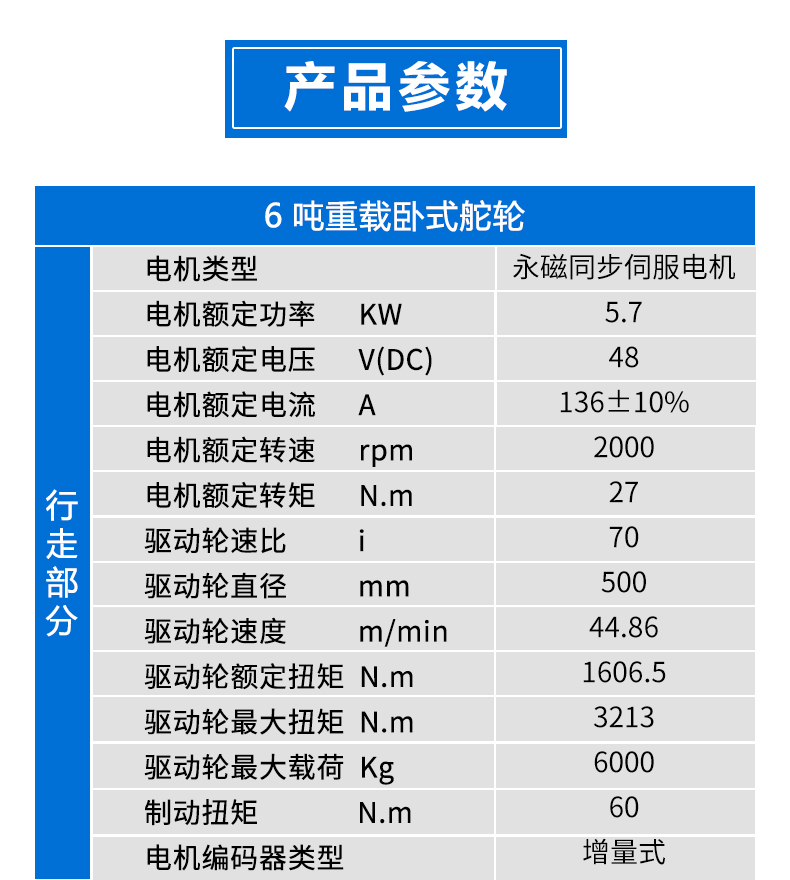 描   述: 6噸級(jí)重載臥式舵輪,集成驅(qū)動(dòng)、轉(zhuǎn)向、稱重三大功能于一體,額定負(fù)載高達(dá)6噸,輕松驅(qū)動(dòng)大型物料、重型設(shè)備,滿足冶金、重型機(jī)械等行業(yè)高強(qiáng)度運(yùn)輸需求。臥式結(jié)構(gòu)深度優(yōu)化安裝空間,顯著降低AGV底盤高度,輕松穿越低矮區(qū)域提升空間利用率。支持±90°甚至更大角度轉(zhuǎn)向,實(shí)現(xiàn)零半徑轉(zhuǎn)彎、側(cè)移、斜行等高階運(yùn)動(dòng)。