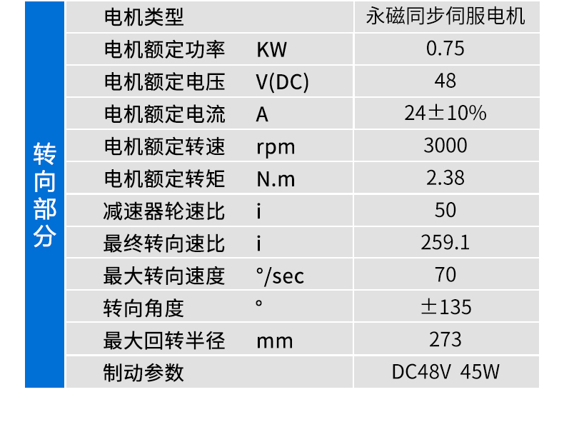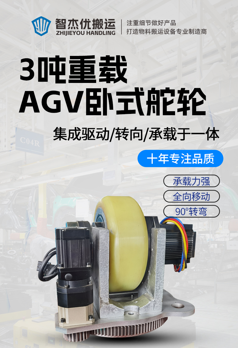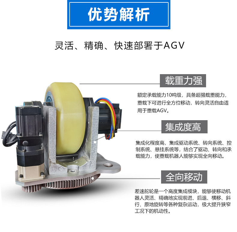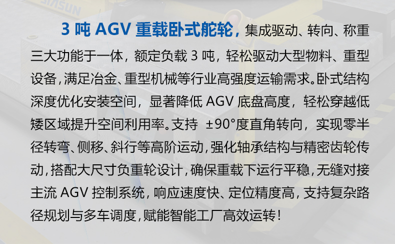 描   述: 3噸AGV重載臥式舵輪,車輪直徑30厘米載重3噸,集成了驅(qū)動、轉(zhuǎn)向和制動等多種功能于一體,適配性強,精度高,采用***的伺服電機及編碼器技術(shù),能夠?qū)崿F(xiàn)***的轉(zhuǎn)矩控制和轉(zhuǎn)向控制,確保車輛在運行中的穩(wěn)定性和準確性,可快速部署在AGV小車上實現(xiàn)全向行駛、縱橫移動、米字行走、原地旋轉(zhuǎn)等動作。舵輪行走機構(gòu)是AGV實現(xiàn)自主移動和***導航的重要組成部分。