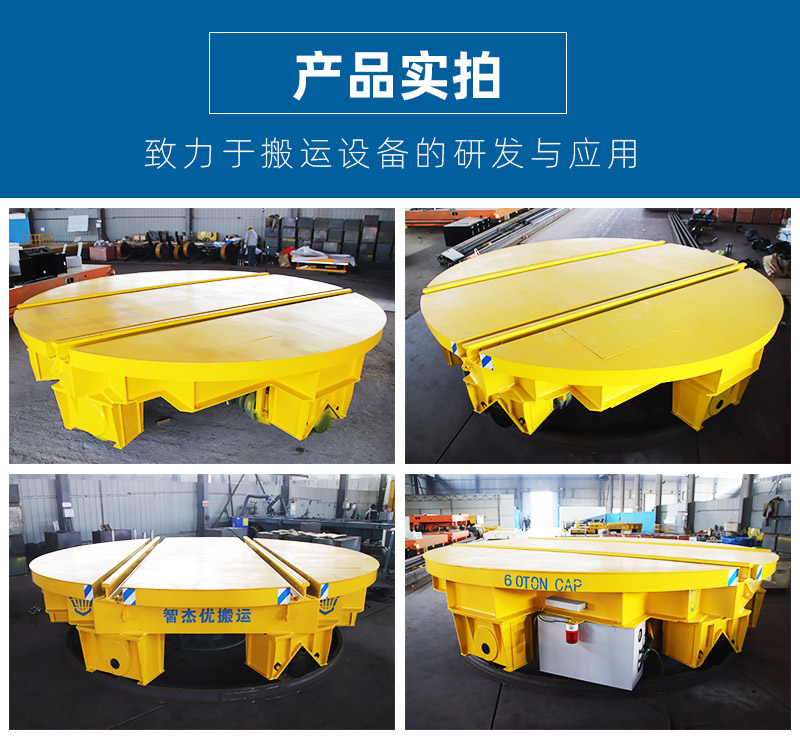 描   述: 這是一臺直徑4米的重型軌道轉(zhuǎn)盤,用來軌道平車搬運車變換軌道使用,支架采用槽鋼和箱型梁焊接,可載重60噸,三相電纜交流380伏供電,多組交流電機驅(qū)動,啟動動力足。