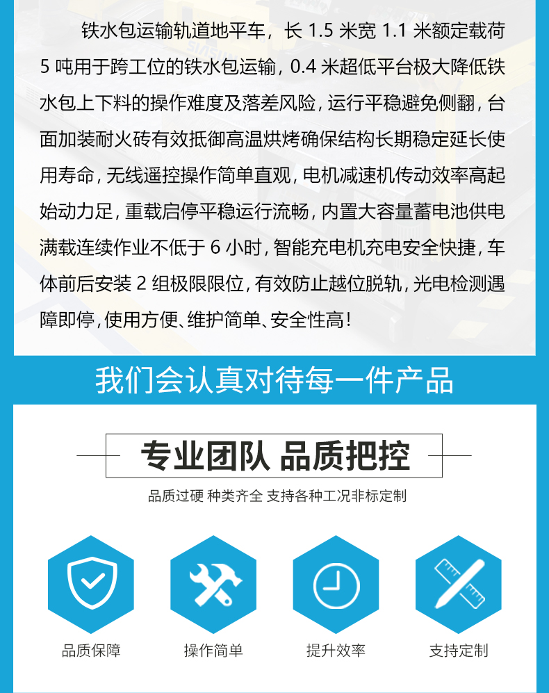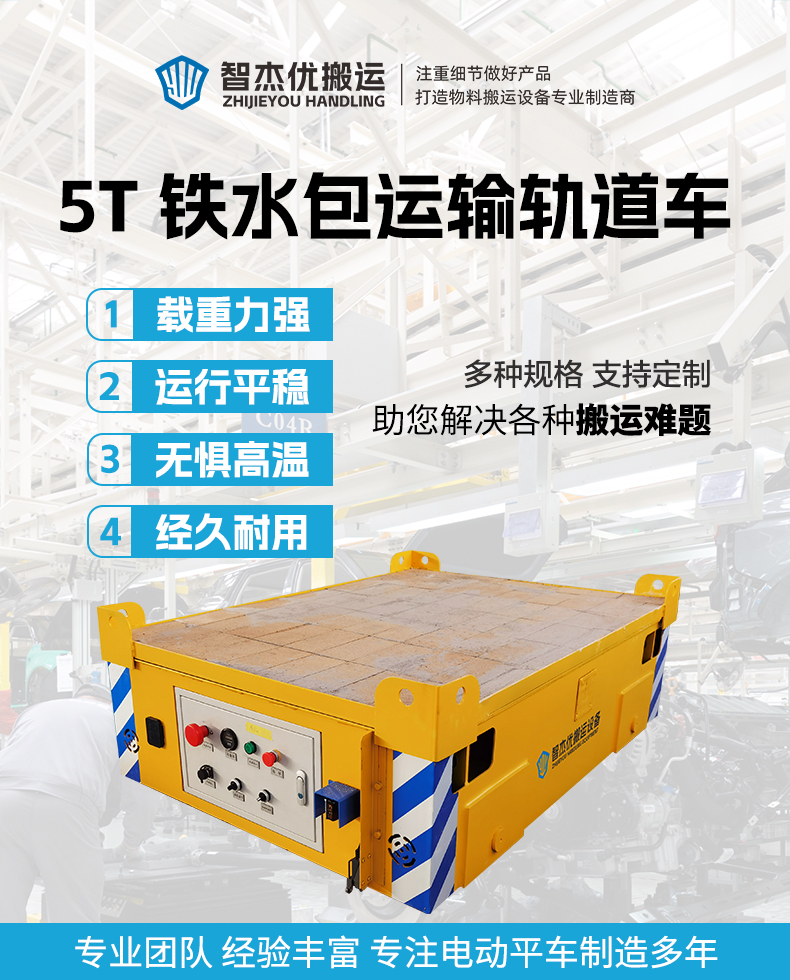 描   述: 在鑄造車(chē)間高溫熔融物料如何安全高效進(jìn)行轉(zhuǎn)運(yùn)?這臺(tái)耐高溫軌道運(yùn)輸平板車(chē)為您提供解決方案。平臺(tái)加鋪耐火磚有效抵御高溫烘烤,5噸額定載荷,可進(jìn)行鐵水包、鋼水包、鋼渣盆等重型物料輕松轉(zhuǎn)運(yùn),蓄電池供電續(xù)航按需定制,操作簡(jiǎn)單維護(hù)方便,多重安全防護(hù)保障物料運(yùn)輸安全高效!