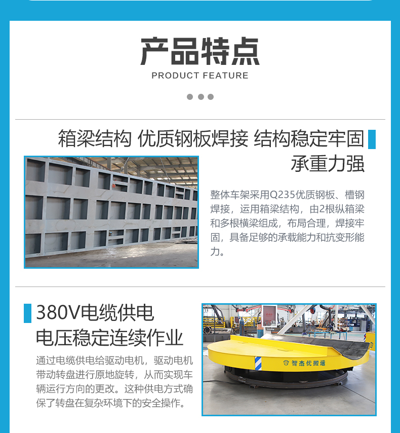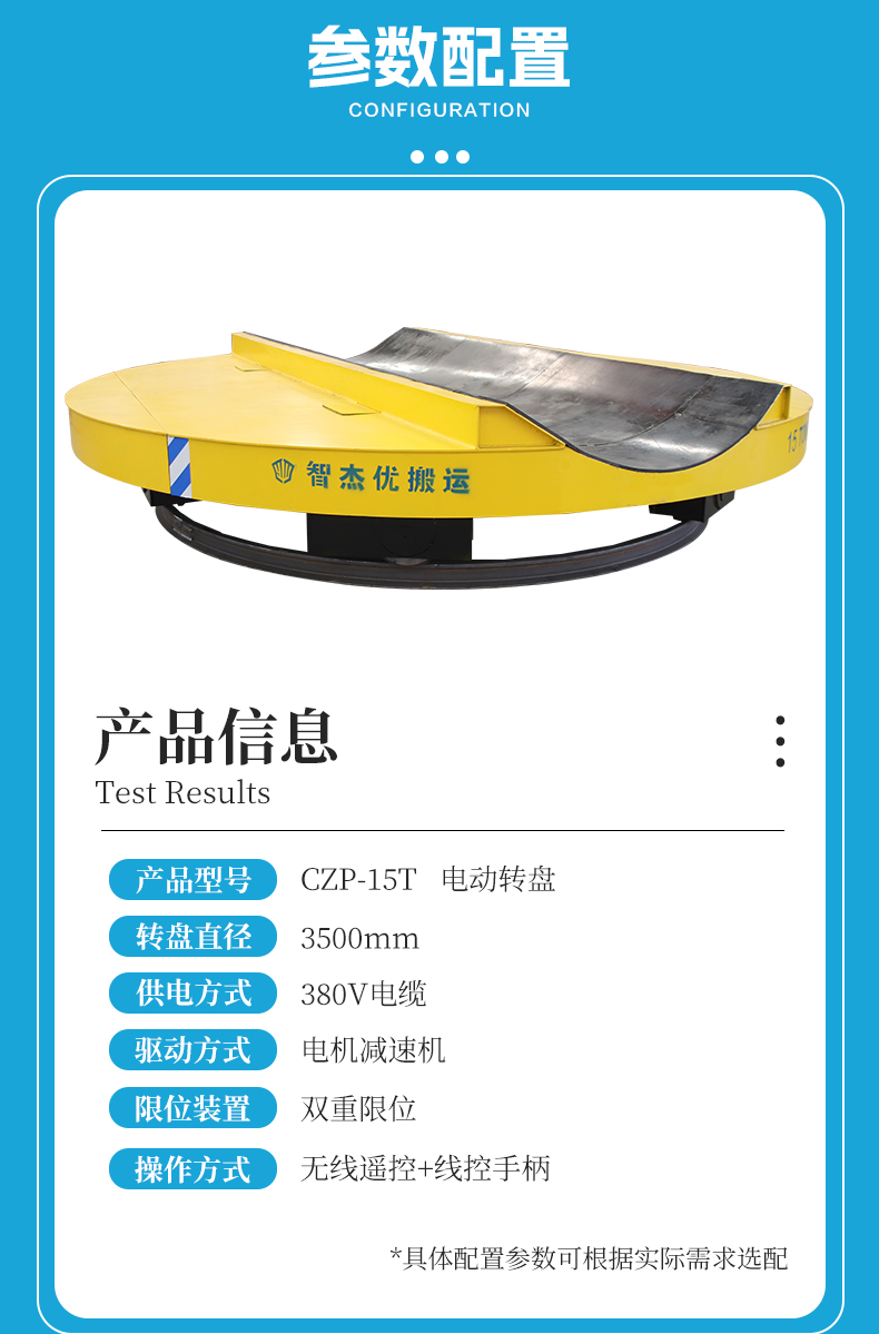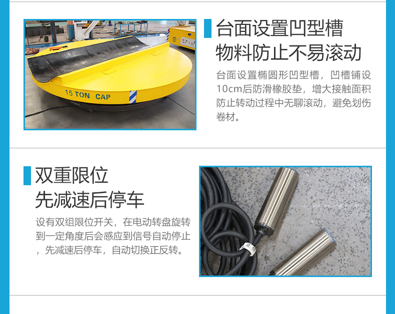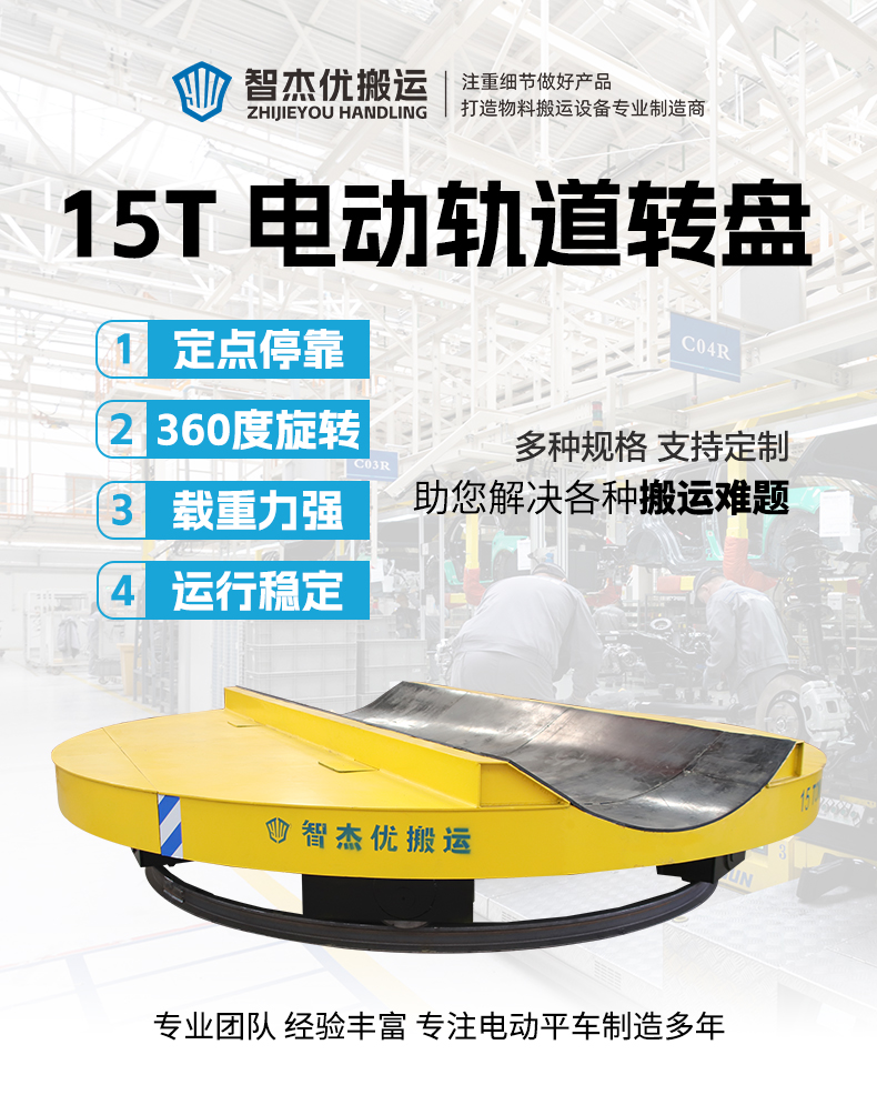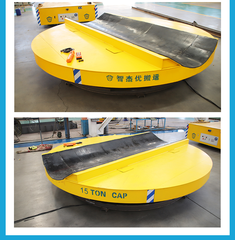 熱線:15517329551 直徑3.5米載重15噸的電動(dòng)轉(zhuǎn)盤旋轉(zhuǎn)臺(tái),客戶用于直徑1.5米長(zhǎng)10米復(fù)合材料卷的原地掉頭作業(yè),平臺(tái)上方設(shè)置橢圓形凹槽方便物料放置,上方鋪設(shè)10cm厚橡膠防滑墊,防止在旋轉(zhuǎn)過程中物料晃動(dòng)避免劃傷物料,通過設(shè)置限位開關(guān)雙重限位,旋轉(zhuǎn)到180度自動(dòng)先減速再緩慢停車,無線遙控控制轉(zhuǎn)盤正反轉(zhuǎn)操作簡(jiǎn)單方便,采用電機(jī)減速機(jī)驅(qū)動(dòng),啟動(dòng)平穩(wěn)緩慢無沖擊,380V電纜線供電不受蓄電池容量限制,可全天候連續(xù)作業(yè),旋轉(zhuǎn)速度可調(diào)節(jié),設(shè)有高中低三個(gè)檔位,電磁制動(dòng)斷電自動(dòng)剎車,聲光報(bào)警時(shí)刻提醒工作人員注意避讓安全性高,結(jié)構(gòu)穩(wěn)定維護(hù)簡(jiǎn)單,電動(dòng)轉(zhuǎn)盤的運(yùn)用,幫助客戶解決長(zhǎng)物料掉頭難的問題節(jié)省人力提升效率,智杰優(yōu)搬運(yùn)專注各種類型搬運(yùn)設(shè)備非標(biāo)定制,咨詢我獲取同款車型報(bào)價(jià)!