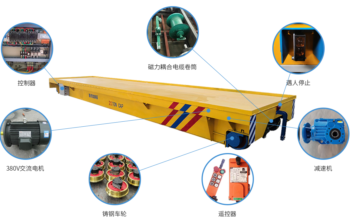 CJG系列電纜卷筒供電電動平車,適將AC380V交流電源通過電纜線供給給牽引電機(jī),通過控制系統(tǒng)控制電機(jī)的啟動、停止、前進(jìn)、后退等。操作系統(tǒng)電壓為安全電壓36V。電纜線依靠轉(zhuǎn)運(yùn)車的卷線裝置來收放電纜線,卷線裝置安裝在電動平車的下方,可加裝PLC系統(tǒng)實(shí)現(xiàn)全自動化控制。該系列車適用于環(huán)境惡劣、高溫環(huán)境、防爆環(huán)境等,由于機(jī)構(gòu)比較簡單,成本較低,是車間過跨較常見等電動平車;相對于蓄一電池電動平車,其使用時間不受限,相對于低壓軌道供電電動平車,對于軌道鋪設(shè)要求不高。該系列車適用于任意載重量、使用頻率較高等場合,如果運(yùn)行距離超過50米,需要增設(shè)布線器來輔助卷線,運(yùn)行距離可以滿足200米。