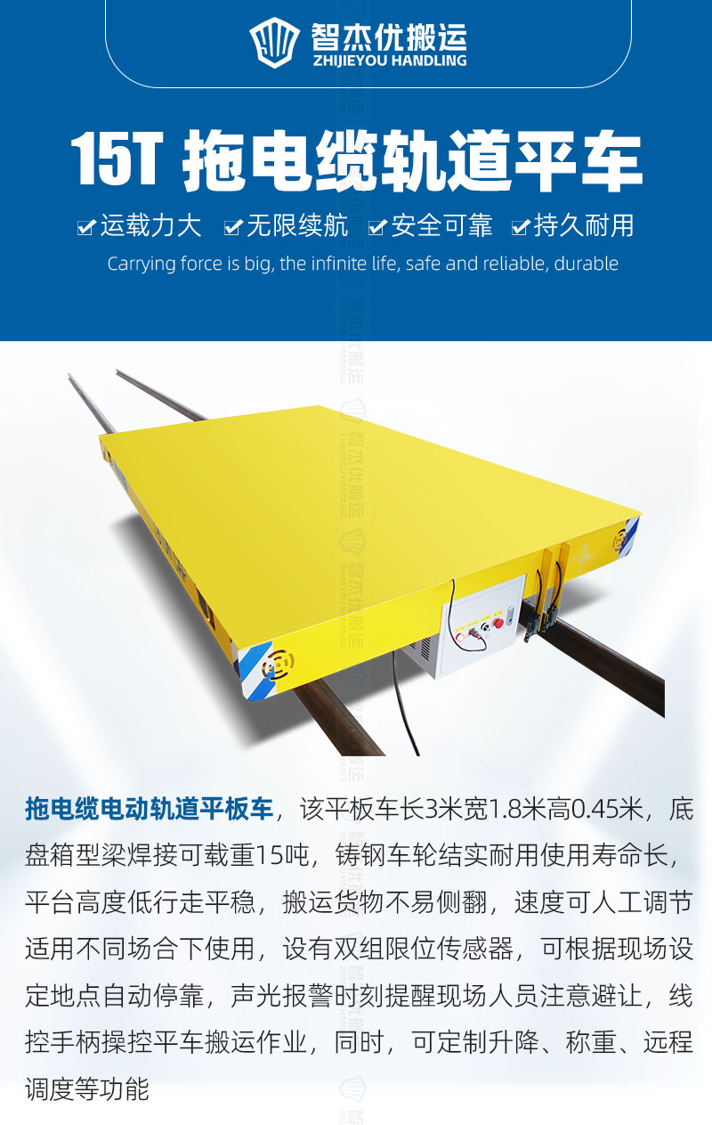 描   述: 這是一臺拖電纜電動軌道平板車,長3米,寬1.8米,高0.45米,行走平穩(wěn),不易側(cè)翻,速度可人工調(diào)節(jié),設(shè)有雙組限位傳感器,定點自動???,聲光報警提醒避讓,線控手柄操控平車搬運作業(yè),同時,可定制升降、稱重、遠(yuǎn)程調(diào)度等功能