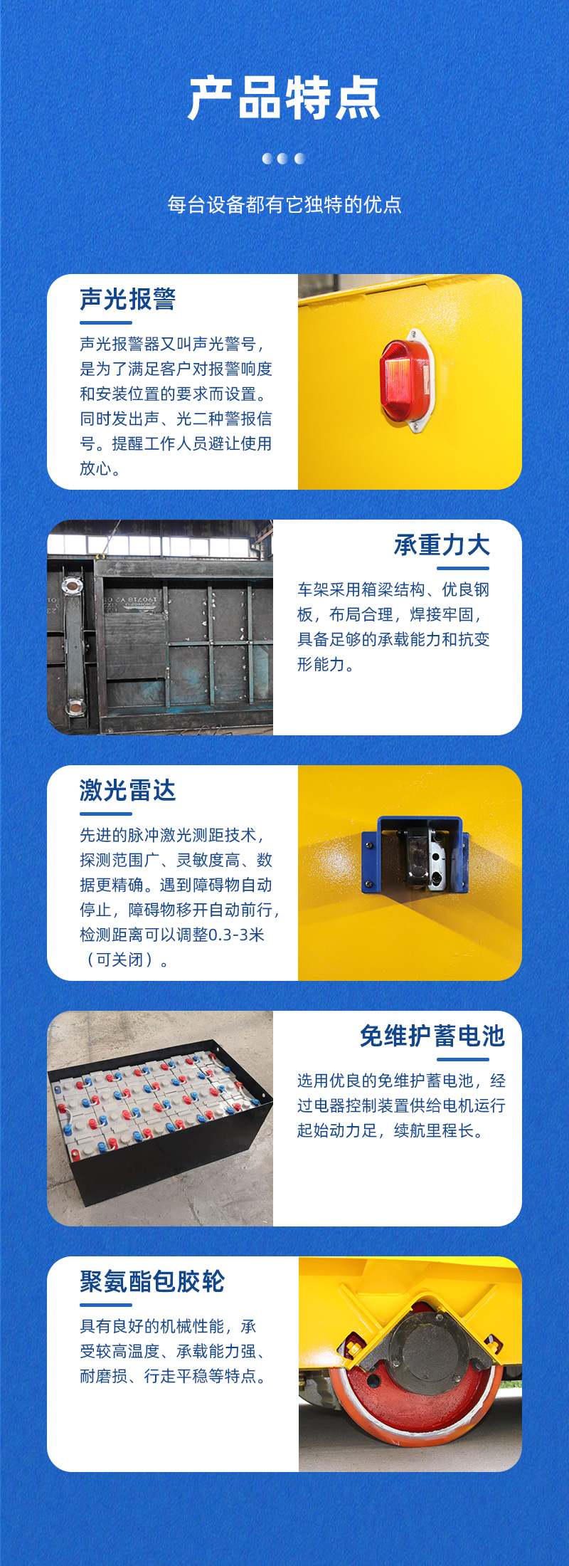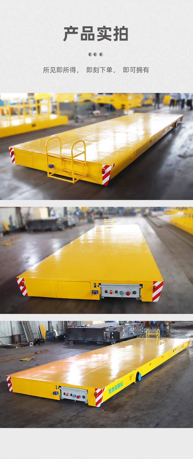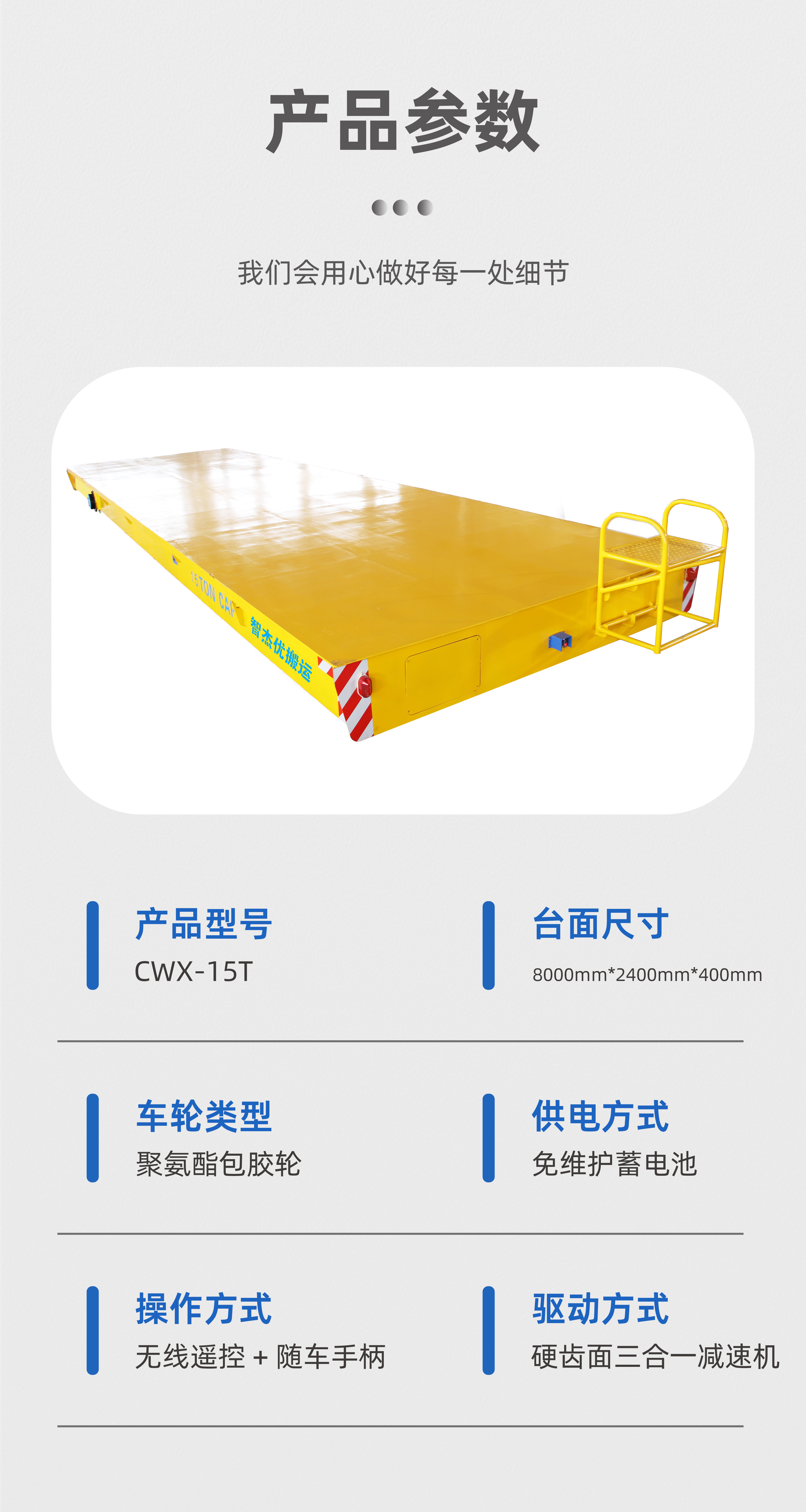 描   述: 無軌電動平車,整車長8米 寬2.4米 高0.4米 載重15噸,大臺面大尺寸,箱梁結(jié)構(gòu),布局合理、焊接牢固,具備足夠的承載能力和抗變形能力,免維護(hù)蓄電池供電,滿載運行3小時。聚氨酯包膠車輪,彈性好、防滑耐磨,不易損傷地面,無線遙控平車前進(jìn)后退,液壓轉(zhuǎn)向,穩(wěn)定靈活;光電檢測遇障自停,聲光一體行走報警,平車前方加裝單人定制座椅,方便工作人員隨車操作,設(shè)計更加人性化,支持自動導(dǎo)航、連接外部通信。