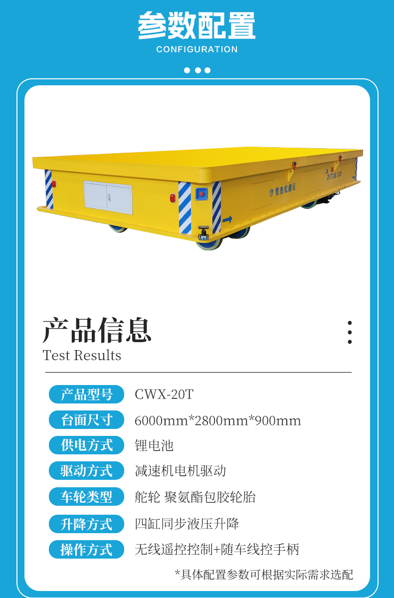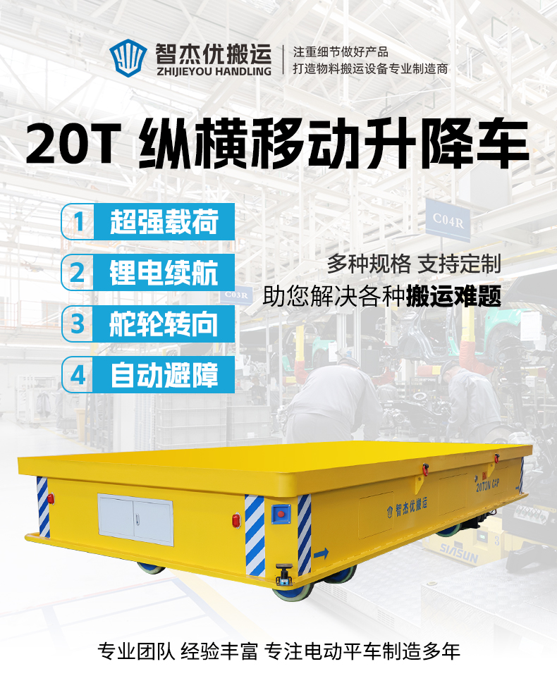 描   述: 重載20噸的縱橫移動升降無軌電動平車。定制化四缸同步升降平臺,載重高度自由調(diào)節(jié)輕松適配托架進行大型設(shè)備轉(zhuǎn)運。伺服電機伺服行星減速機黃金組合,動力澎湃響應(yīng)快***控制毫米級位移,復(fù)雜路徑也能絲滑運行。內(nèi)置高精度稱重傳感器,實時顯示載重數(shù)據(jù),超載自動預(yù)警杜絕安全隱患。輪系配備四組差速舵輪系統(tǒng),360°全向移動,狹窄空間內(nèi)也能進退自如、直角轉(zhuǎn)彎、橫向平移、原地旋轉(zhuǎn)行云流水,全向移動減少無效路徑提高搬運效率