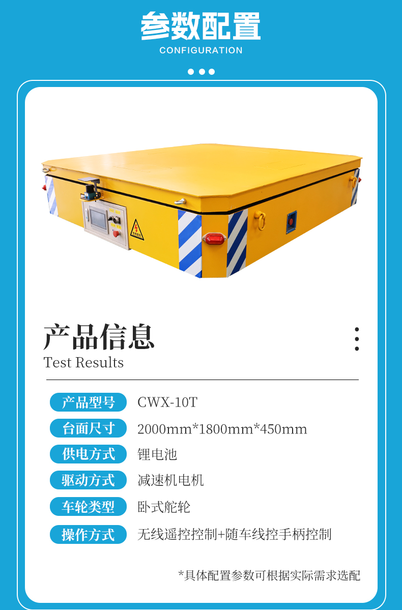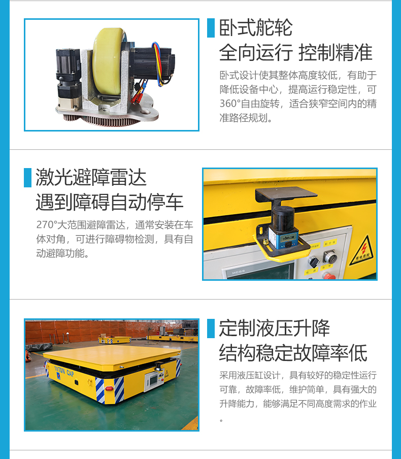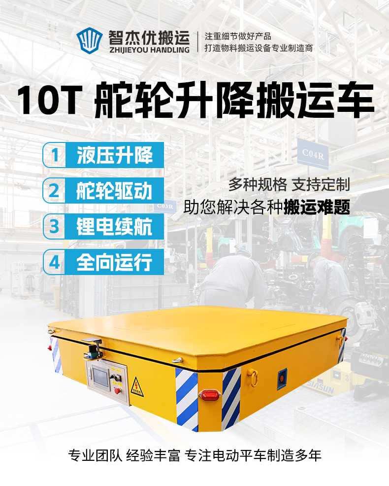 描   述: 舵輪升降搬運車,以2米*1.8米緊湊車身,10噸級強悍載重、360度全向靈活操控及智能升降功能,為狹窄工況重型機械轉(zhuǎn)運場景提供一站式解決方案。搭載臥式舵輪驅(qū)動系統(tǒng),支持原地0轉(zhuǎn)彎半徑旋轉(zhuǎn),狹窄通道自由穿梭,平臺定制升降行程55mm,可快速潛入工裝架底部完成頂升托舉,一鍵操控平穩(wěn)升降,高性能鋰電池組供電,滿載10噸連續(xù)作業(yè)時間不低于3小時,無懼高強度作業(yè)需求,告別傳統(tǒng)燃油設(shè)備噪音與污染,綠色節(jié)能!