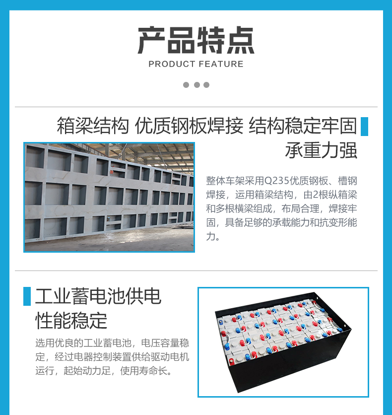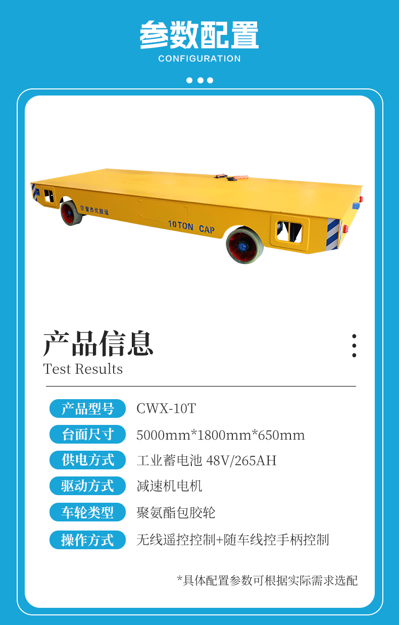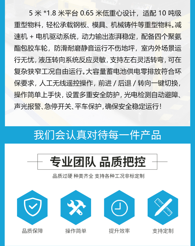 描   述: 5米*1.8米平臺(tái)0.65米低重心設(shè)計(jì),適配10噸級(jí)重型物料,輕松承載鋼板、模具、機(jī)械鑄件等重型物料。減速機(jī)+電機(jī)驅(qū)動(dòng)系統(tǒng),動(dòng)力輸出澎湃穩(wěn)定,配備四個(gè)聚氨酯包膠車輪,防滑耐磨靜音運(yùn)行不傷地坪,室內(nèi)外場(chǎng)景運(yùn)行無憂,液壓轉(zhuǎn)向系統(tǒng)反應(yīng)靈敏,支持左右靈活轉(zhuǎn)彎,可在復(fù)雜狹窄工況自由運(yùn)行。大容量蓄電池供電零排放符合環(huán)保要求,人工無線遙控操作,前進(jìn)/后退/轉(zhuǎn)向一鍵切換,操作簡(jiǎn)單上手快,多重安全防護(hù)確保運(yùn)輸安全!