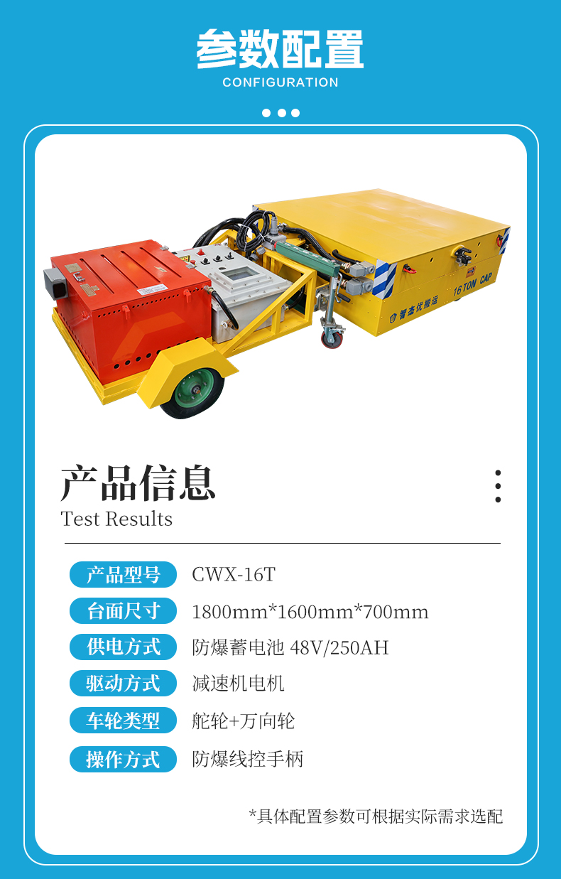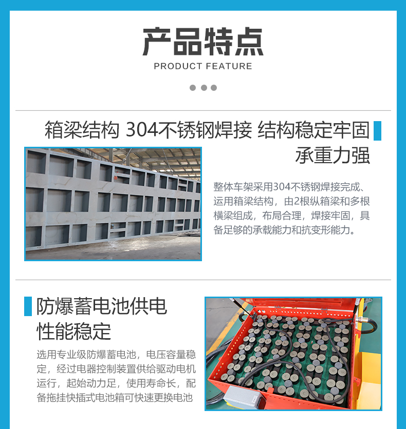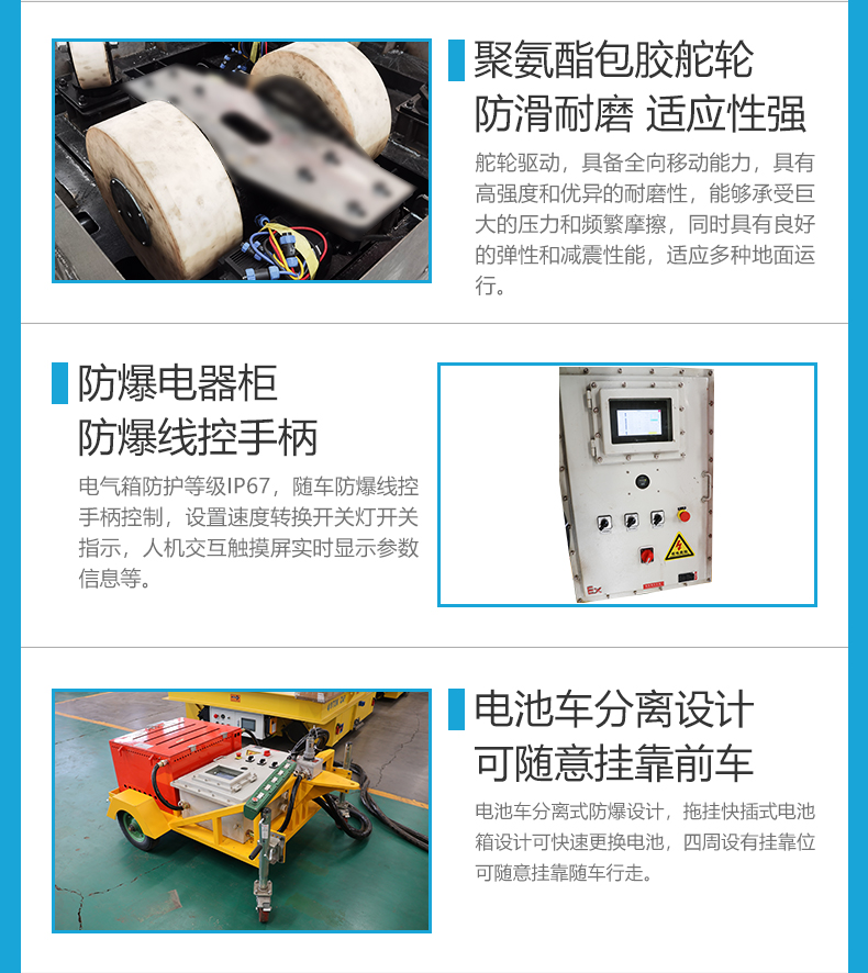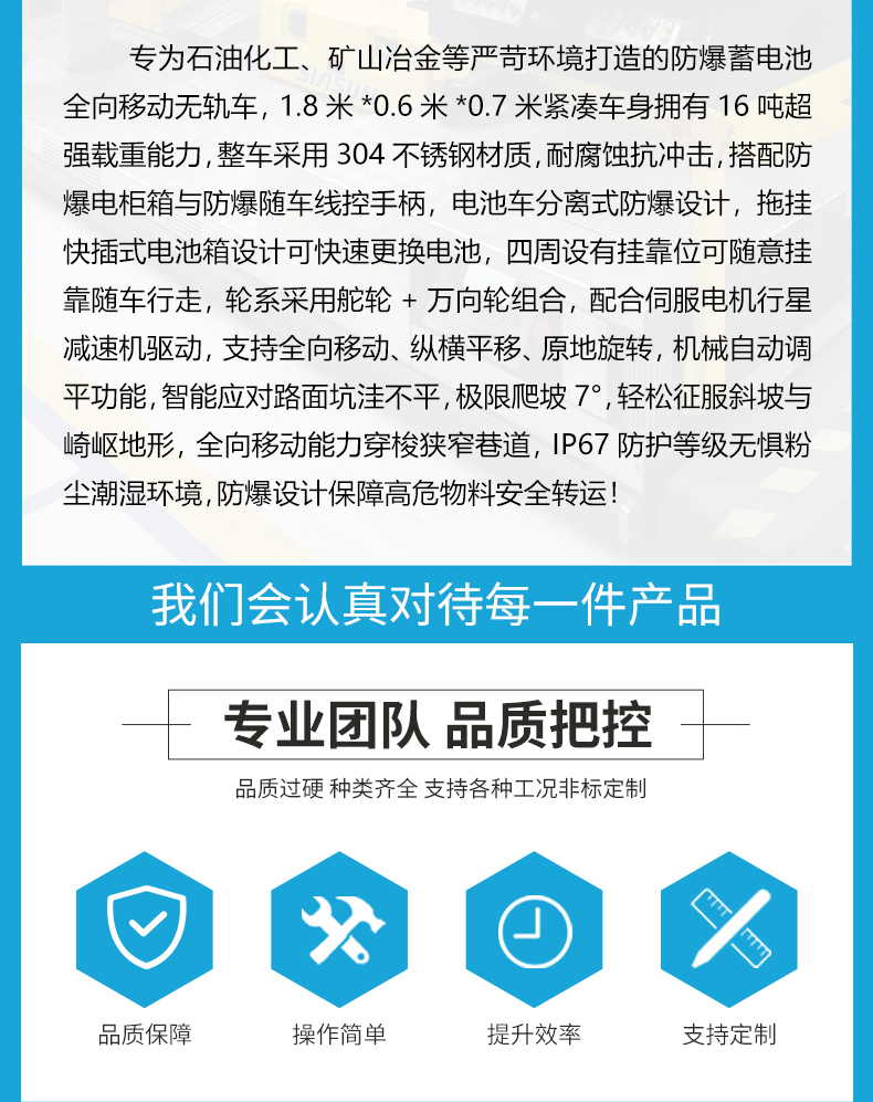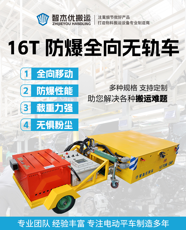 描   述: 防爆蓄電池全向移動無軌車,1.8米*0.6米*0.7米緊湊車身16噸***載重能力,整車304不銹鋼材質(zhì)耐腐蝕抗沖擊,搭配防爆電柜箱與防爆隨車線控手柄,電池車分離式防爆設計,拖掛快插式電池箱設計可快速更換電池,四周設有掛靠位可隨意掛靠隨車行走,舵輪+萬向輪組合配合伺服電機行星減速機驅(qū)動,支持全向移動、縱橫平移、原地旋轉(zhuǎn),機械自動調(diào)平功能,極限爬坡7°,IP67防護等級無懼粉塵潮濕環(huán)境,防爆設計
