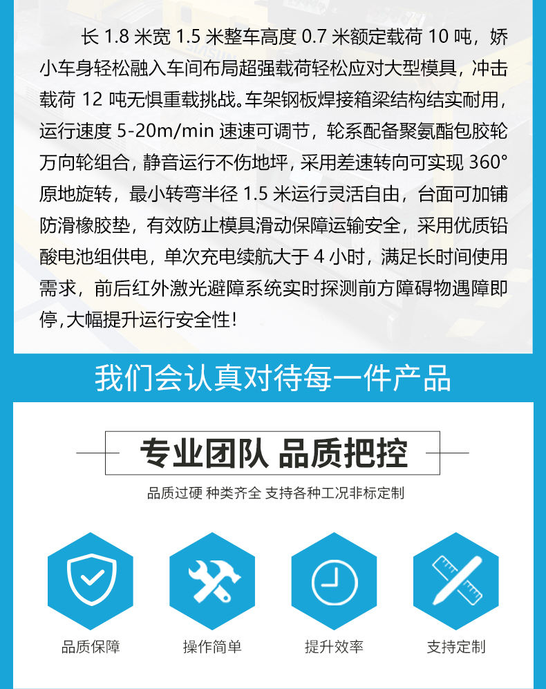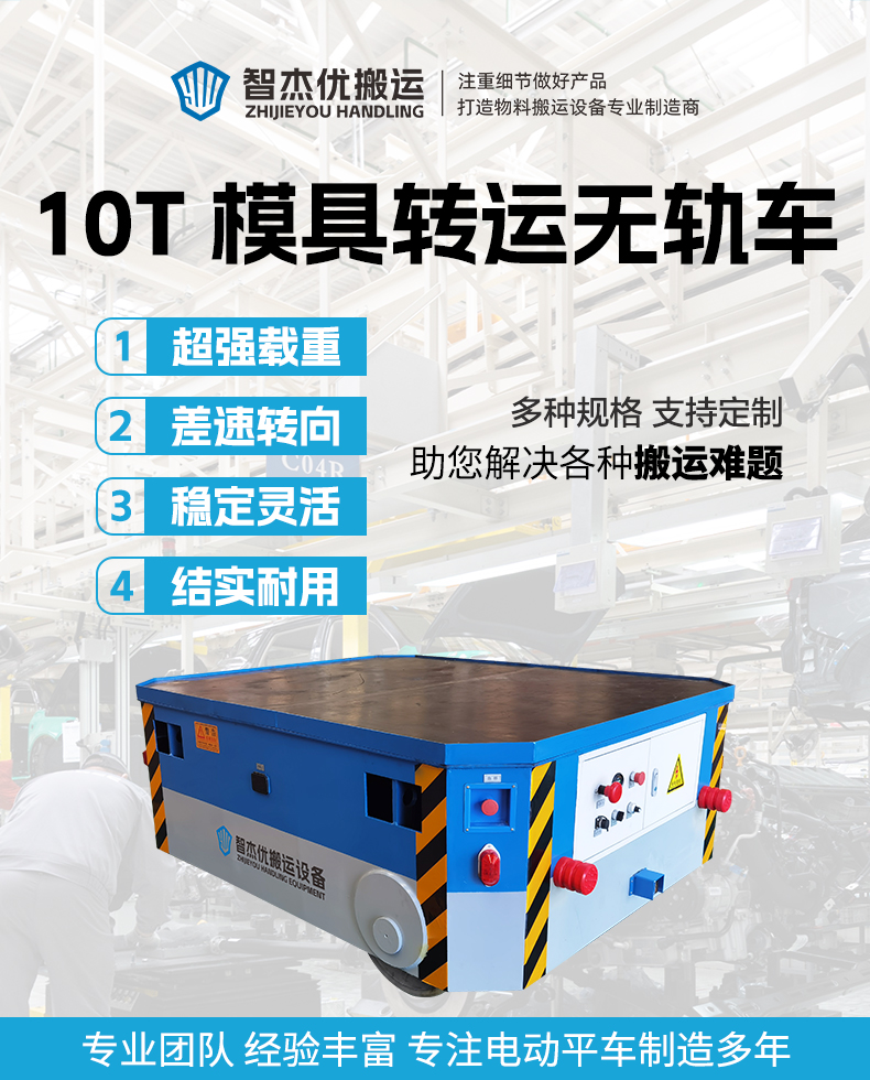 描   述: 在繁忙的汽車零部件生產(chǎn)車間,重型模具的***、高效、安全轉(zhuǎn)運(yùn)是提升效率的關(guān)鍵環(huán)節(jié),智杰優(yōu)專為模具轉(zhuǎn)運(yùn)定制的差速轉(zhuǎn)向無(wú)軌車,以1.8米*1.5米*1.7米緊湊車身,10噸級(jí)超大載荷,差速轉(zhuǎn)向***靈活,安全可靠與超長(zhǎng)續(xù)航于一身,是您車間內(nèi)物料搬運(yùn)的得力助手!