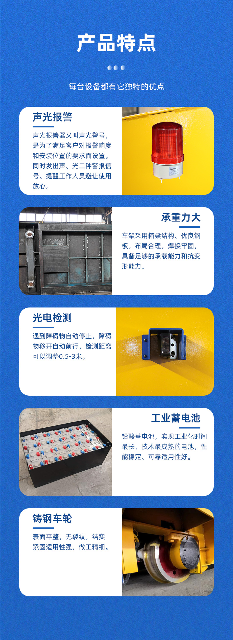 這是一臺轉(zhuǎn)彎軌道平車試機(jī)現(xiàn)場,整車長寬1.2米 高0.45米,載重2噸。平車小巧靈活,運(yùn)行在轉(zhuǎn)彎軌道上,無線遙控平車前進(jìn)后退,蓄電池供電節(jié)能環(huán)保,配備8個(gè)鑄鋼車輪硬度高耐磨防滑,加裝導(dǎo)向輪及回轉(zhuǎn)支撐,確保彎道行駛運(yùn)行流暢平穩(wěn)、防止掉道,平車內(nèi)側(cè)前后設(shè)有限位開關(guān),可設(shè)置多點(diǎn)位自動停靠,方便用戶定點(diǎn)搬運(yùn)作業(yè),安全裝置上平車具備欠壓、過壓、過流、超載、短路、低電量等防護(hù),前后配備光電檢測,遇障自停,聲光報(bào)警提醒避讓!