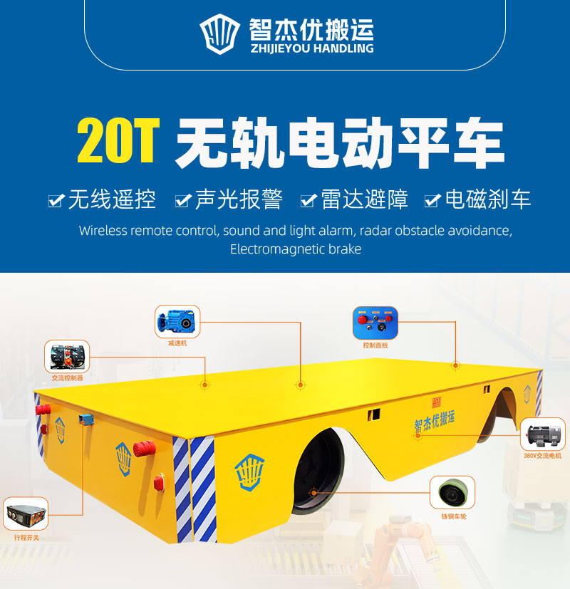 該無軌電動(dòng)平車可輕松搬運(yùn)20噸的貨物,平臺(tái)鋼板耐摔耐砸抗沖擊能力強(qiáng),車身裝有聲光報(bào)警光電檢測(cè)遇到障礙自動(dòng)停車,結(jié)合現(xiàn)代化電氣工程,可實(shí)現(xiàn)無人駕駛、遠(yuǎn)程微機(jī)控制等多種操控方式,智杰優(yōu)制造電動(dòng)平車多年,產(chǎn)品經(jīng)驗(yàn)豐富,期待您的合作。