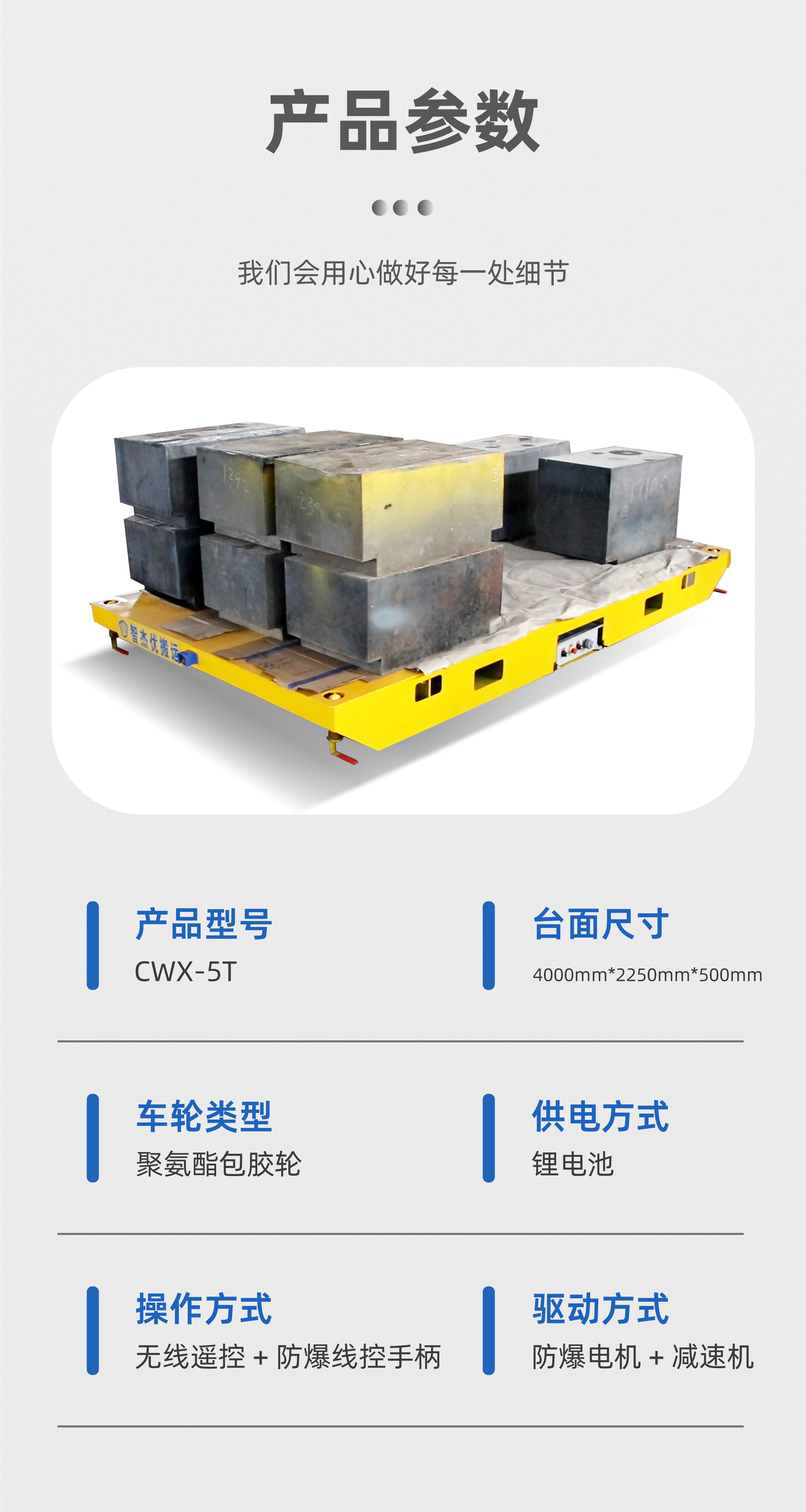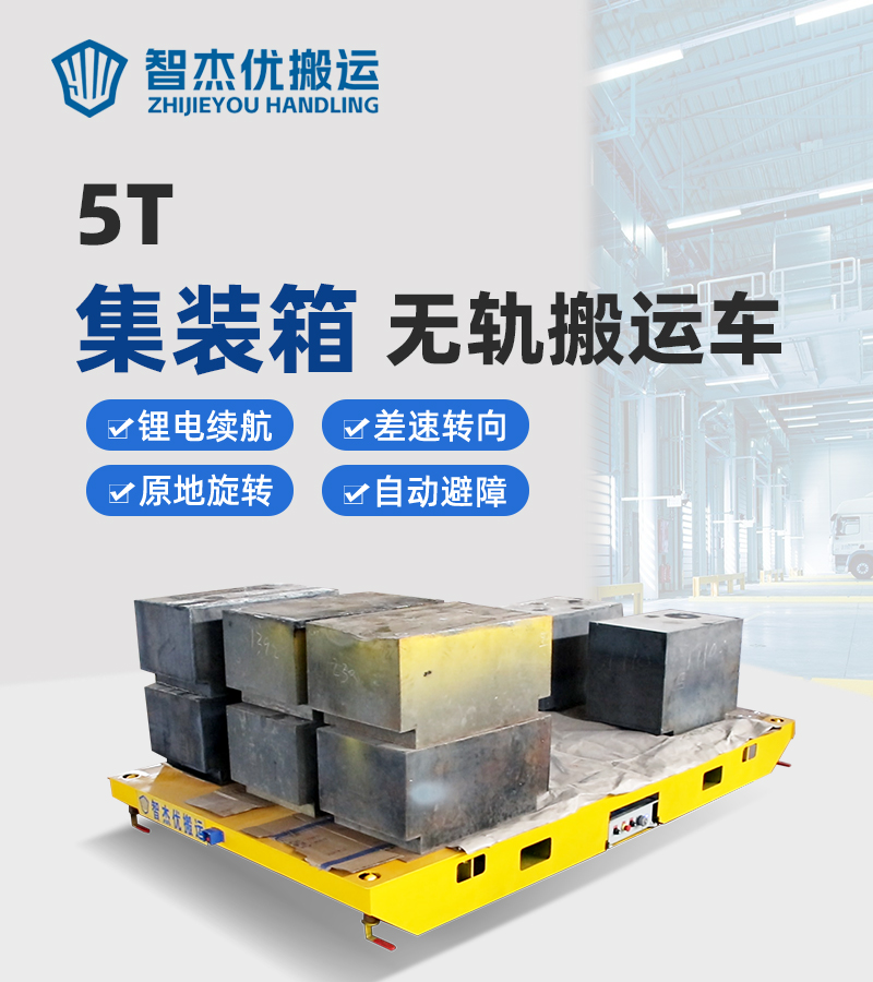 描   述: 集裝箱搬運無軌電動平車,整車長4米 寬2.25米高0.5米,載重5噸,鋰電池供電續(xù)航里程長,載重滿負荷運行2.2小時,箱梁結(jié)構(gòu)穩(wěn)定牢固,臺面焊接集裝箱專用對碼鎖,確保貨物安全;聚氨酯包膠萬向車輪,彈性好防滑耐磨轉(zhuǎn)向靈活,無線遙控平車前進后退,左右轉(zhuǎn)彎原地旋轉(zhuǎn),防爆電氣箱、防爆操作手柄均達國家防爆要求,前后光電檢測自動避障。