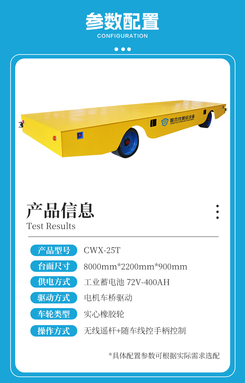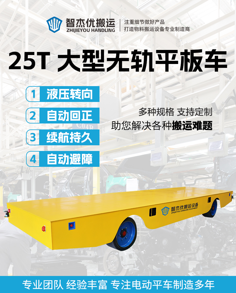 描   述: 專為重型設(shè)備轉(zhuǎn)運(yùn)研制的25噸液壓轉(zhuǎn)向無軌地平車,8米*2.2米寬闊平臺0.9米定制高度25噸額定載荷輕松承載大型機(jī)械、重型鋼構(gòu)、鋼卷等。