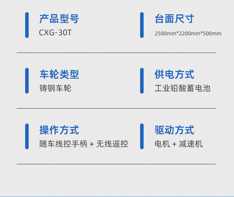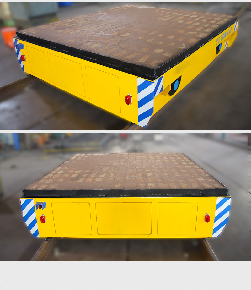 描   述: 這是一臺(tái)山東客戶定制的蓄電池軌道電動(dòng)平車,該車長(zhǎng)2.5米,寬2.2米,高0.5米,車架箱型梁焊接,結(jié)構(gòu)牢固,載重量大,可載重30噸,應(yīng)客戶使用要求,臺(tái)面鋪設(shè)耐火磚;平車采用蓄電池供電,運(yùn)行距離不受限制,遙控器一鍵操作,可啟動(dòng)停止、前進(jìn)后退、調(diào)速等,設(shè)有雙限位開關(guān),可根據(jù)現(xiàn)場(chǎng)設(shè)定地點(diǎn)自動(dòng)停靠,前后光電檢測(cè),遇障自停,聲光報(bào)警保障安全,能夠在垂直軌道、L型軌道、S型軌道、弧形軌道及易爆、擺渡場(chǎng)合使用。
