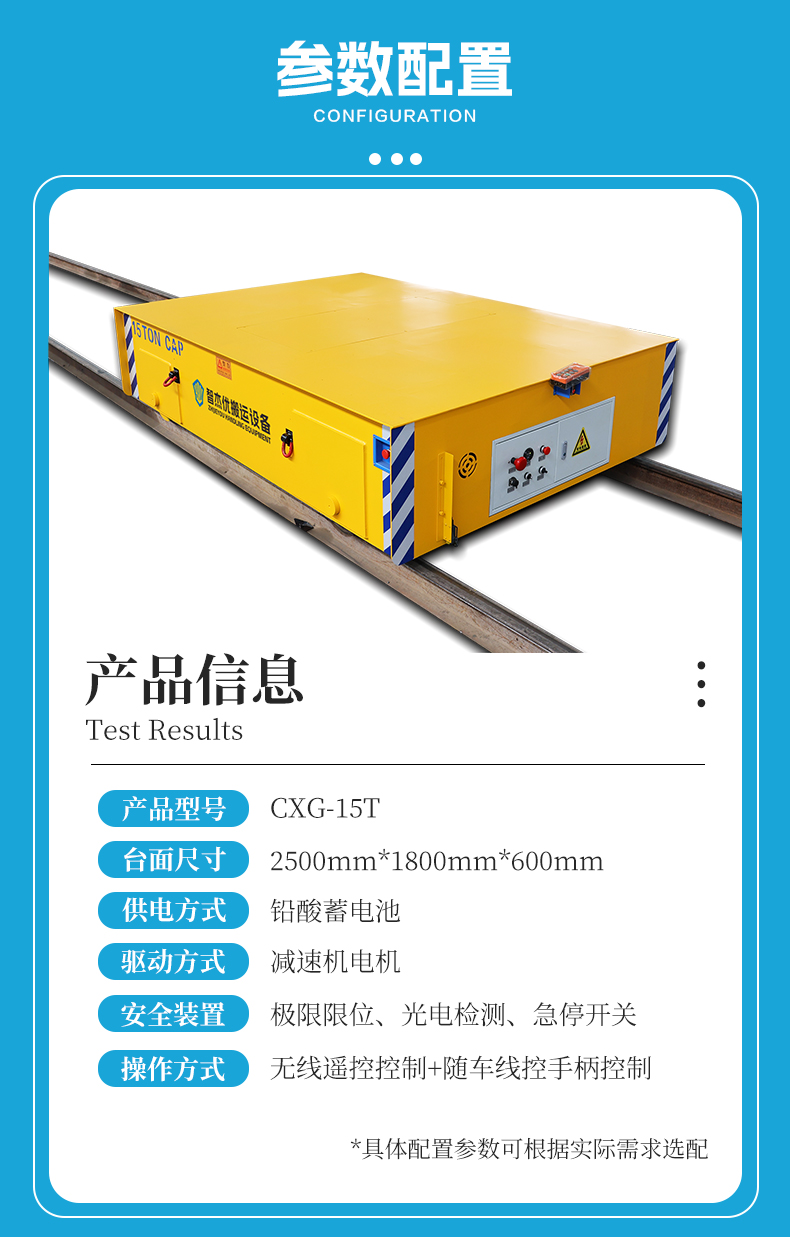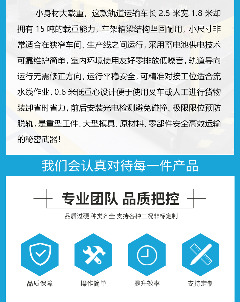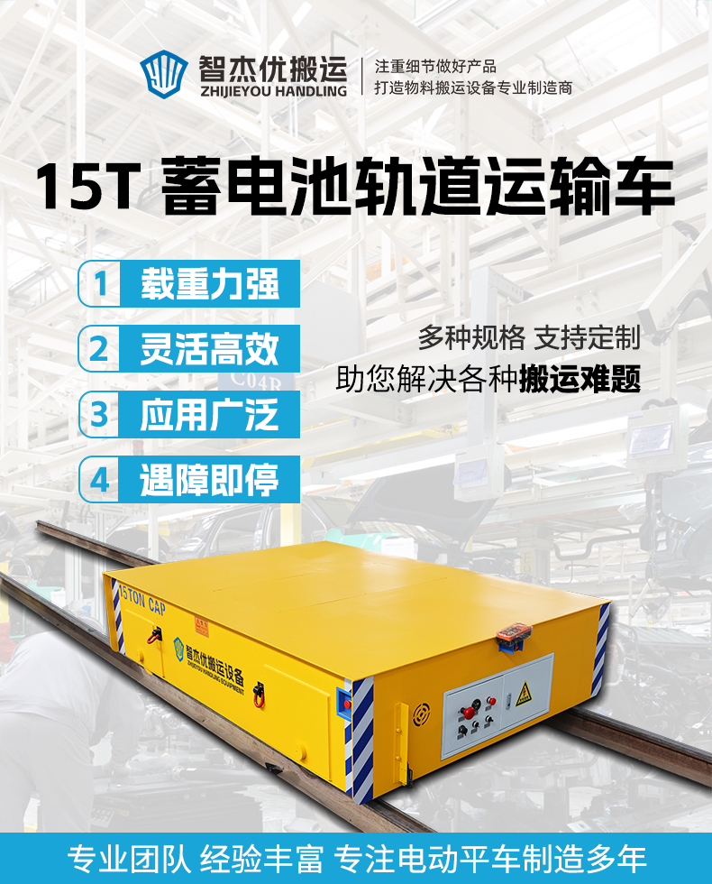 描   述: 小空間,大承載,專為高效車間打造的電動軌道運輸車,2.5米*1.8米緊湊車身15噸額定載荷,輕松穿梭在狹窄通道與生產(chǎn)線間,固定軌道運行平穩(wěn)安全,適用于重型工件、大型模具、原材料、零部件等物料轉(zhuǎn)運,經(jīng)濟高效的解決大重量搬運難題!