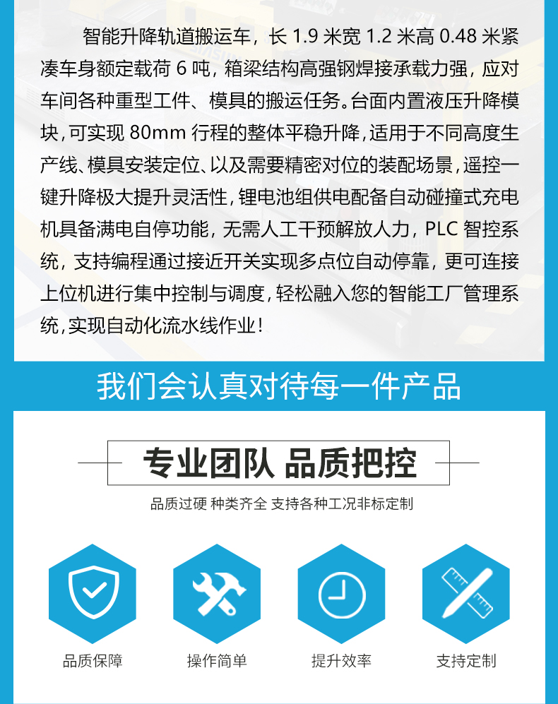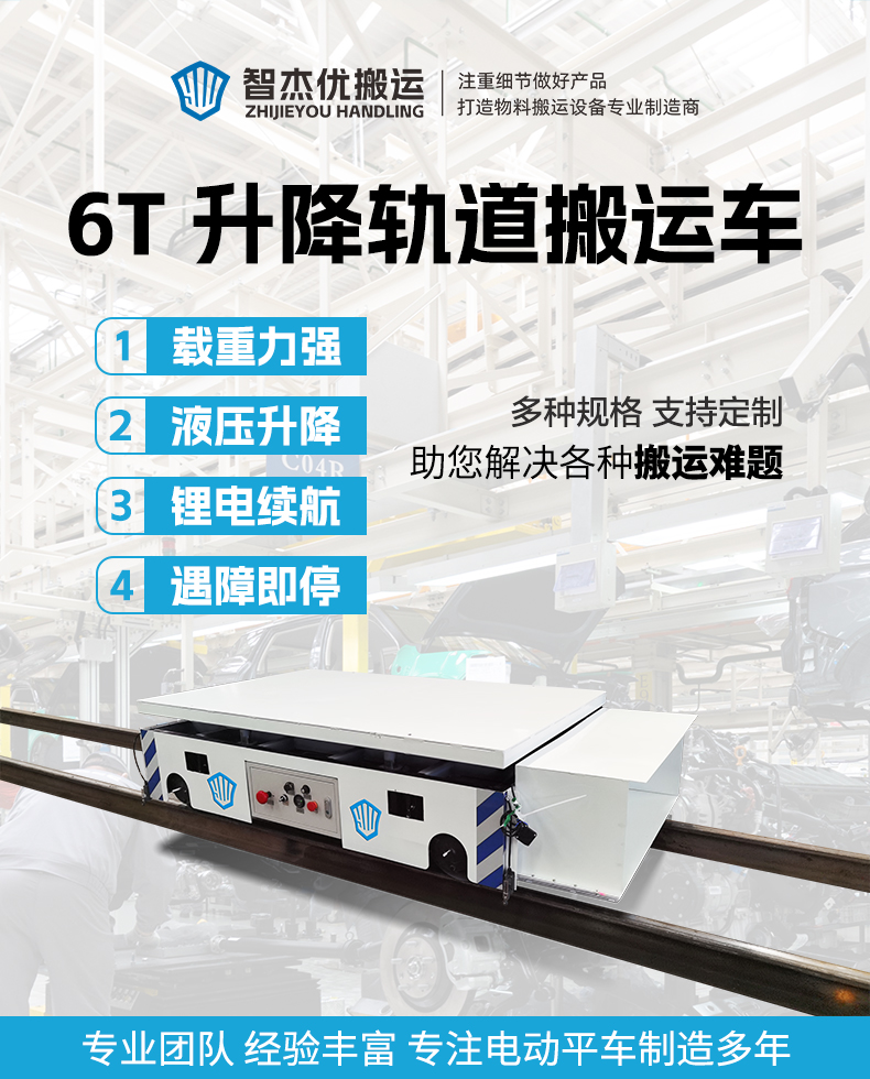 描   述: 6噸升降式軌道搬運車,長1.9米寬1.2米高0.48米定制化緊湊車身,堅固箱梁結(jié)構(gòu)承載力強穩(wěn)定牢固,長期使用不變形不塌陷,無線遙控操作簡單便捷,臺面定制升降模塊只進行高低場景的物料搬運,極大提升靈活性與生產(chǎn)效率!